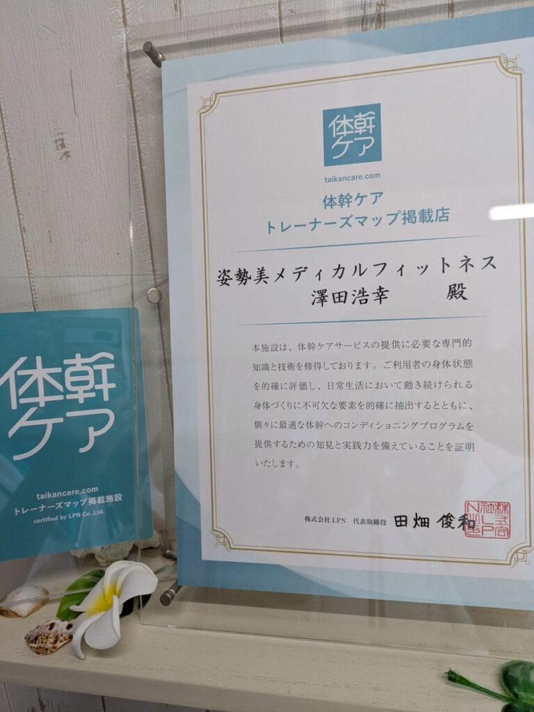 『本施設は、体幹ケアサービス提供に必要な専門知識と技術を習得しております。ご利用者の身体状態を的確に評価し、日常生活において動き続けられる身体づくりに不可欠な要素を的確に抽出するとともに、個々の最適な体幹へのコンデショニングプログラムを提供するための知見と実践力を備えている事を証明いたします』